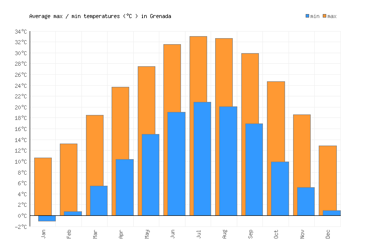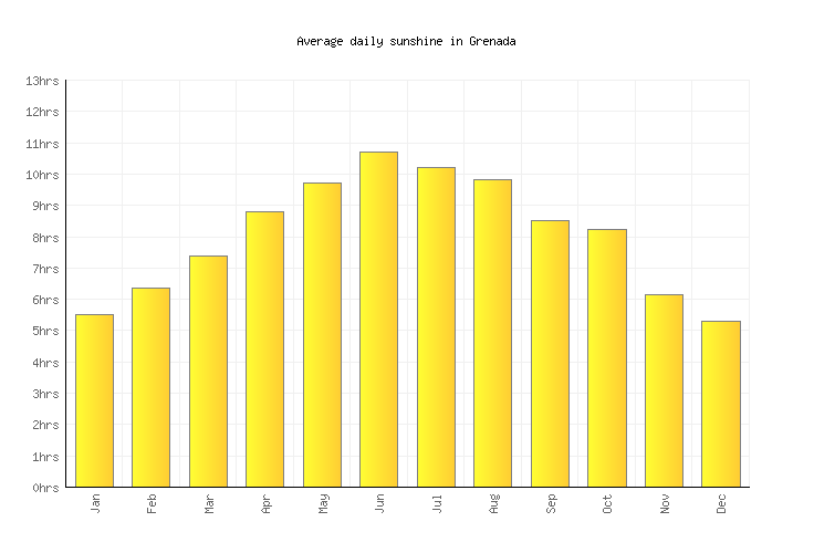 Grenada is located in the tropics. The weather is all about sun and rain. Grenada has sunlight throughout the year, with the sun rising at between 5 - 6 am in the morning, and setting by 6pm at night. The sound of a cock crowing often signifies the start of the day. The temperature is usually about 28 degrees Celsius or 82 degrees Fahrenheit. On extremely hot days, the temperature rises to over 32 degrees Celsius. Grenada is affected by two seasons: rainy season and dry season.